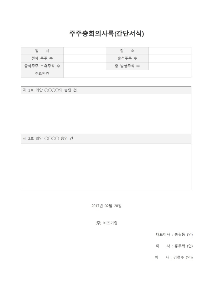 9,000원/월주주총회의사록(간단서식)입니다. 일시, 장소, 전체주주수, 출석주주수, 출석주주보유주식수, 총발행주식수, 주요안건, 제1호의안, 제2호의안 등의 항목으로 구성되어있습니다.