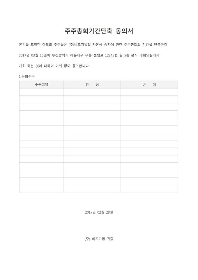 9,000원/월주주총회기간단축 동의서입니다. 동의주주 성명, 찬성, 반대 등의 항목으로 구성되어있습니다.