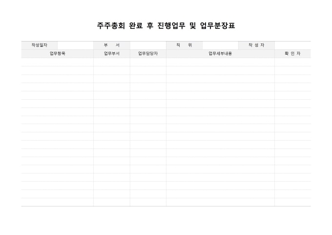 9,000원/월주주총회 완료 후 진행업무 및 업무분장표입니다. 작성일자, 부서, 직위, 작성자, 업무항목, 업무부서, 업무담당자, 업무세부내용, 확인자 등의 항목으로 구성되어있습니다.