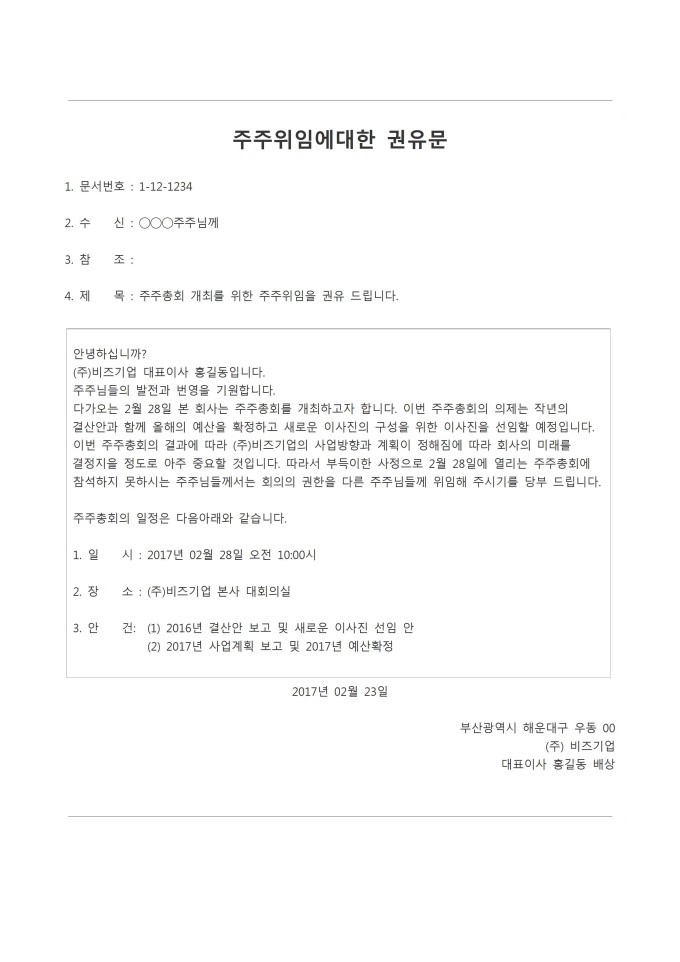 9,000원/월주주위임에 대한 권유문입니다. 기업의 대표님께서 주주님들께 주주총회의 위임에 대한 권유를 당부드릴때 사용하실 수 있습니다.