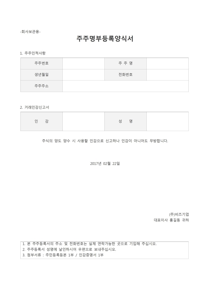 9,000원/월주주명부등록양식서입니다. 주주인적사항 주주번호, 주주명, 생년월일, 전화번호, 주주주소, 거래인감신고서, 인감, 성명 등의 항목으로 구성되어있습니다.