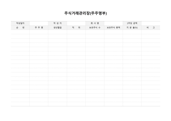 9,000원/월주식거래관리장(주주명부)입니다. 작성일자, 작성자, 회사명, 1주당금액, 순번, 주주명, 생년월일, 직위, 보유주식수, 보유주식총액, 지분율(%), 비고 등의 항목으로 구성되어있습니다.