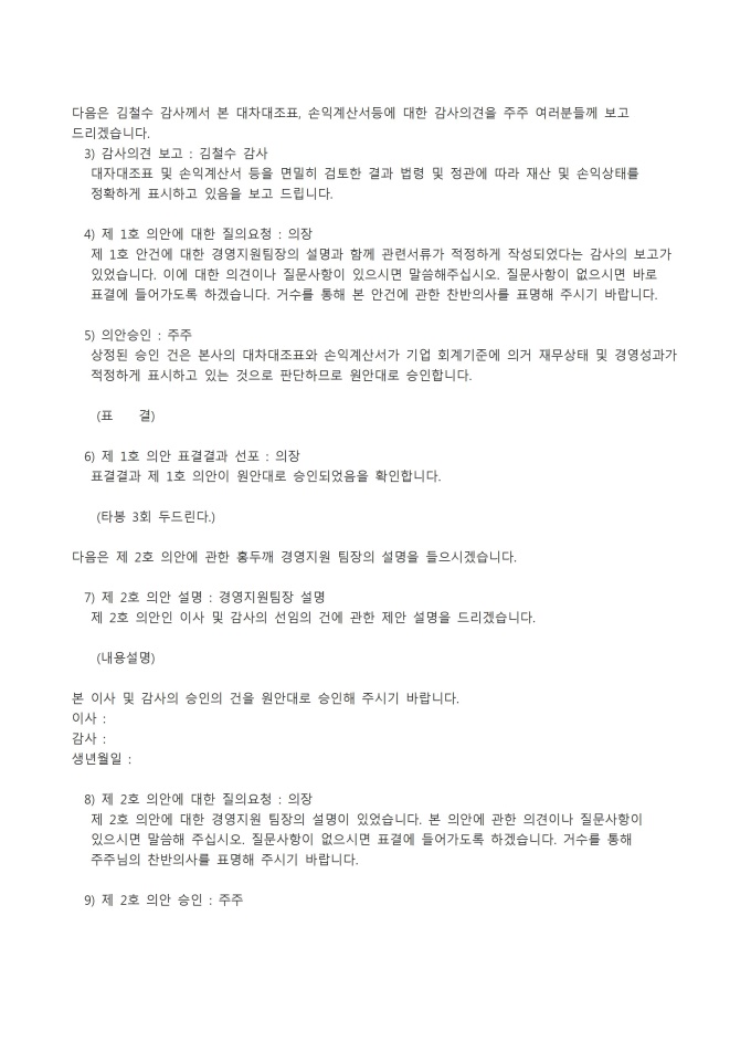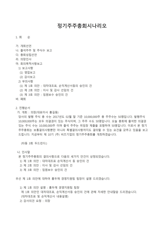 9,000원/월정기주주총회시나리오 입니다. 회순, 진행순서, 등으로 순차적으로 구성되어있습니다.