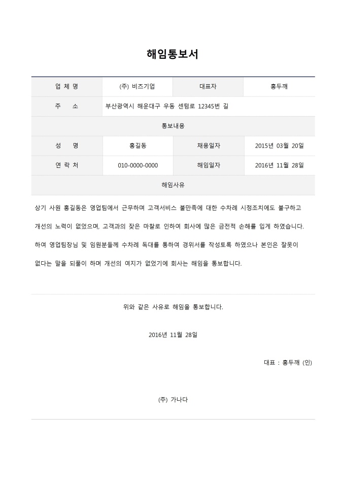 해임통보서입니다. 업체명, 대표자, 주소, 통보내용, 성명, 채용일자, 연락처, 해임일자, 해임사유 등의 항목으로 구성되어있습니다.