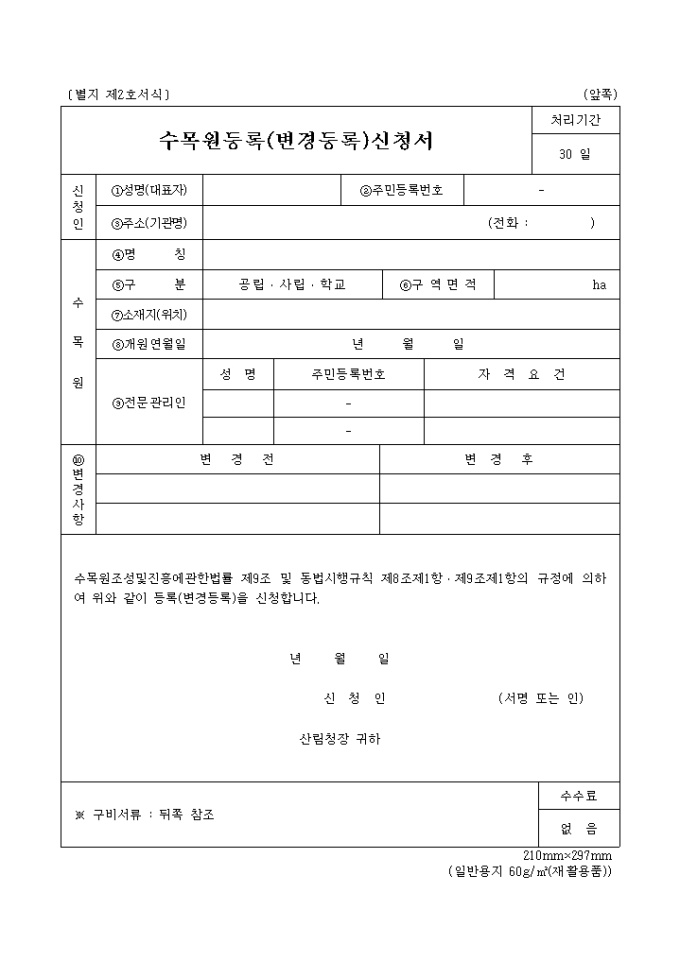 9,000원/월별지 제2호서식으로 수목원조성및진흥에관한법률 제9조 및 동법시행규칙 제8조제1항·제9조제1항의 규정에 의하여 수목원 등록(변경등록)을 신청할때 사용하는 양식입니다.