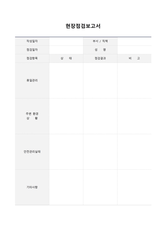 현장점검보고서입니다. 작성일자, 부서/직책, 점검일자, 성명, 점검항목, 상태, 점검결과, 비고, 휴일관리, 주변환경상황, 안전관리실태, 기타사항 등의 항목으로 구성되어있습니다.