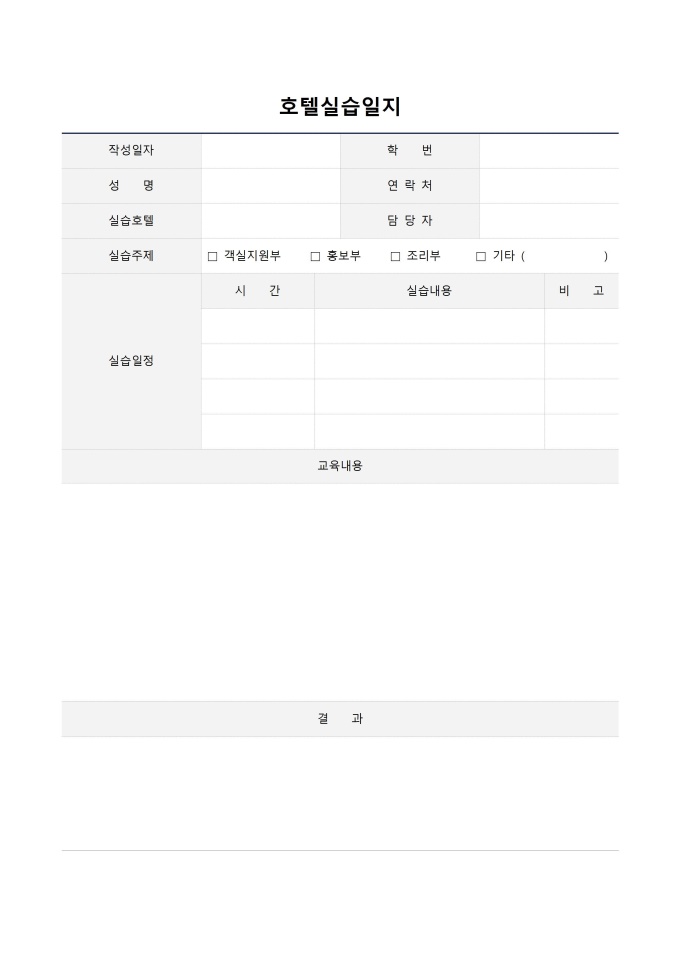 9,000원/월호텔실습일지입니다. 작성일자, 학번, 성명, 연락처, 실습호텔, 담당자, 실습주제, 실습일정, 시간, 실습내용, 비고, 교육내용, 결과 등의 항목으로 구성되어있습니다.