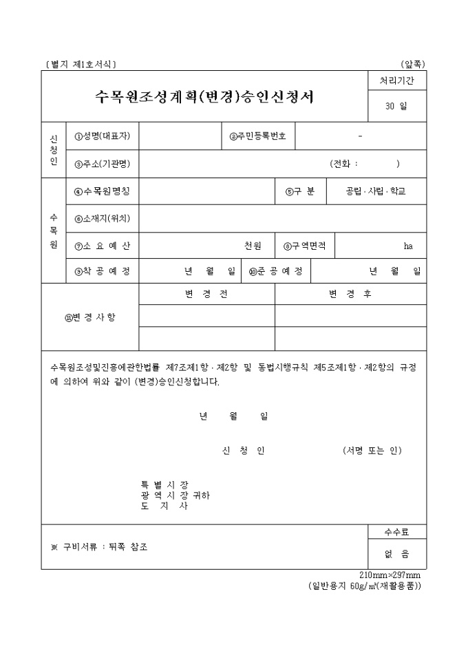 9,000원/월별지 제1호서식으로 수목원조성및진흥에관한법률 제7조제1항·제2항 및 동법시행규칙 제5조제1항·제2항의 규정에 의하여 (변경)승인신청할때 사용하는 양식입니다.