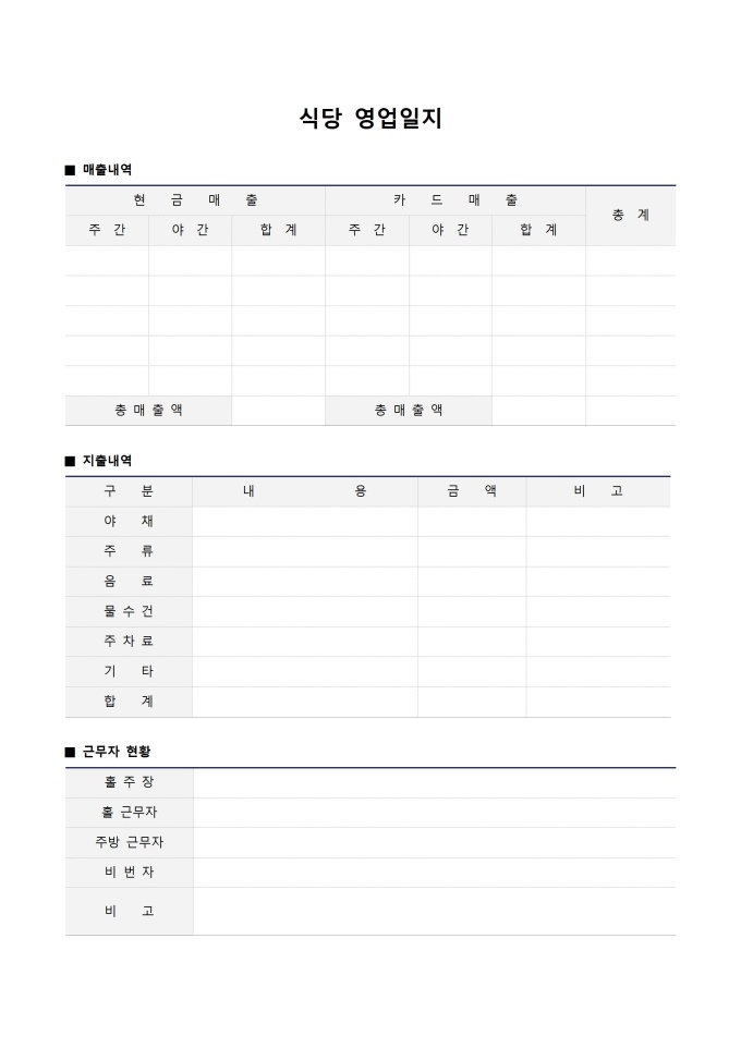 9,000원/월식당영업일지 입니다. 매출내역(현금매출, 카드매출, 총계), 지출내역(구분, 내용, 금액, 비고), 근무자현황 등의 항목으로 구성되어있습니다.