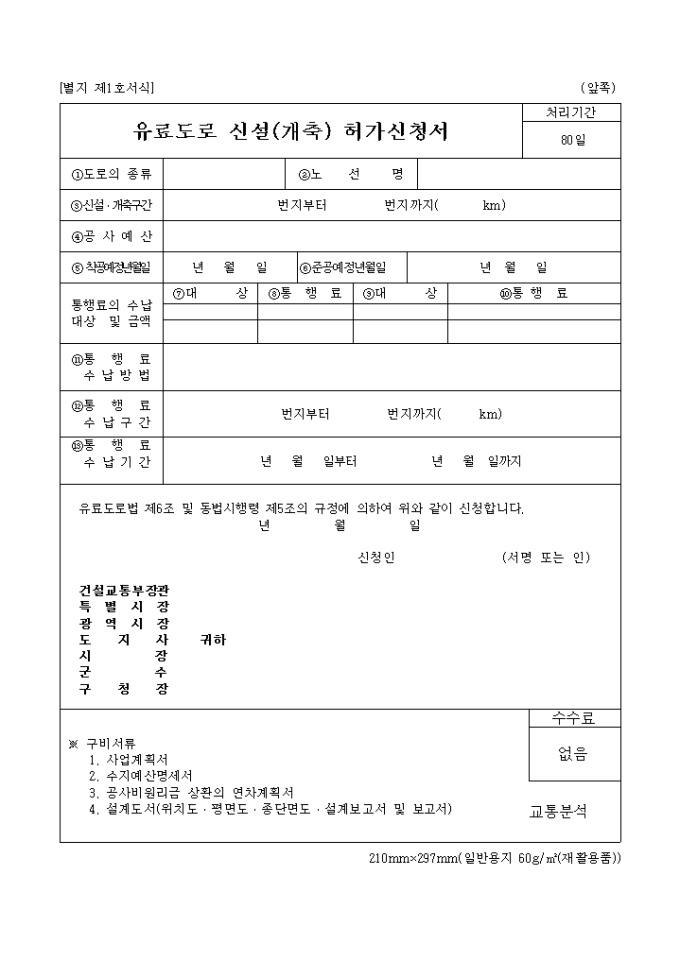 9,000원/월별지 제1호서식으로 유료도로법 제6조 및 동법시행령 제5조의 규정에 의하여 유료도로신설,개축허가를 신청할때 사용하는 양식입니다.