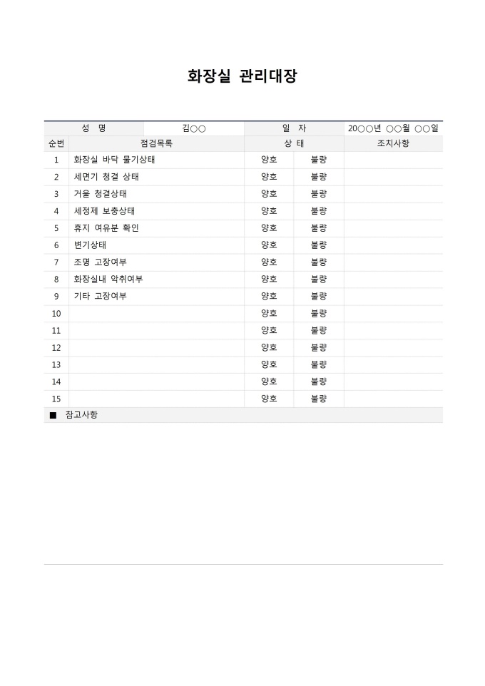 9,000원/월화장실 관리대장 입니다. 성명, 일자, 순번, 점검목록, 상태, 조치사항, 참고사항 등의 항목으로 구성되어 있습니다.