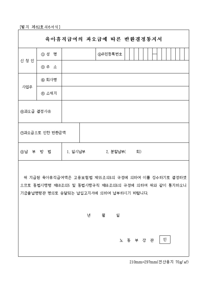 9,000원/월별지 제62호의6서식으로 지급된 육아휴직급여액은 고용보험법 제55조의6의 규정에 의하여 이를 징수하기로 결정하였으므로 동법시행령 제68조의5 및 동법시행규칙 제66조의6의 규정에 의하여 기금출납명령관 명의로 송달되는 납입고지서에 의하여 납부하길 요청하는 통지서입니다.