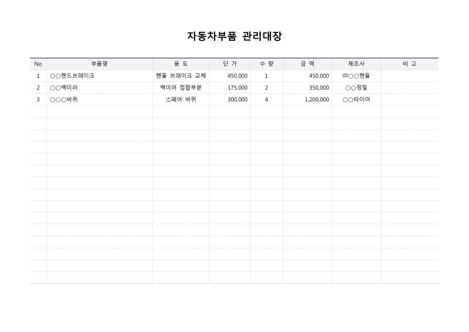 9,000원/월자동차부품관리대장 입니다. No, 부품명, 용도, 단가, 수량, 금액, 제조사, 비고 등의 항목으로 구성되어 있습니다.