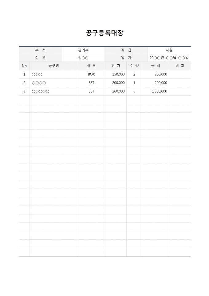 9,000원/월공구등록대장입니다.부서, 직급, 성명, 일자, No, 공구명, 규격, 단가, 수량, 금액, 비고 등의 항목으로 구성되어 있습니다.