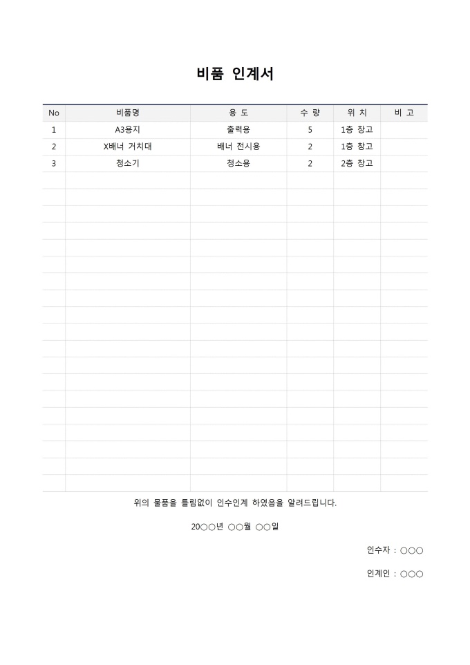 9,000원/월비품 인계서입니다. No, 비품명, 용도, 수량, 위치, 비고 등의 항목으로 구성되어 있습니다.
