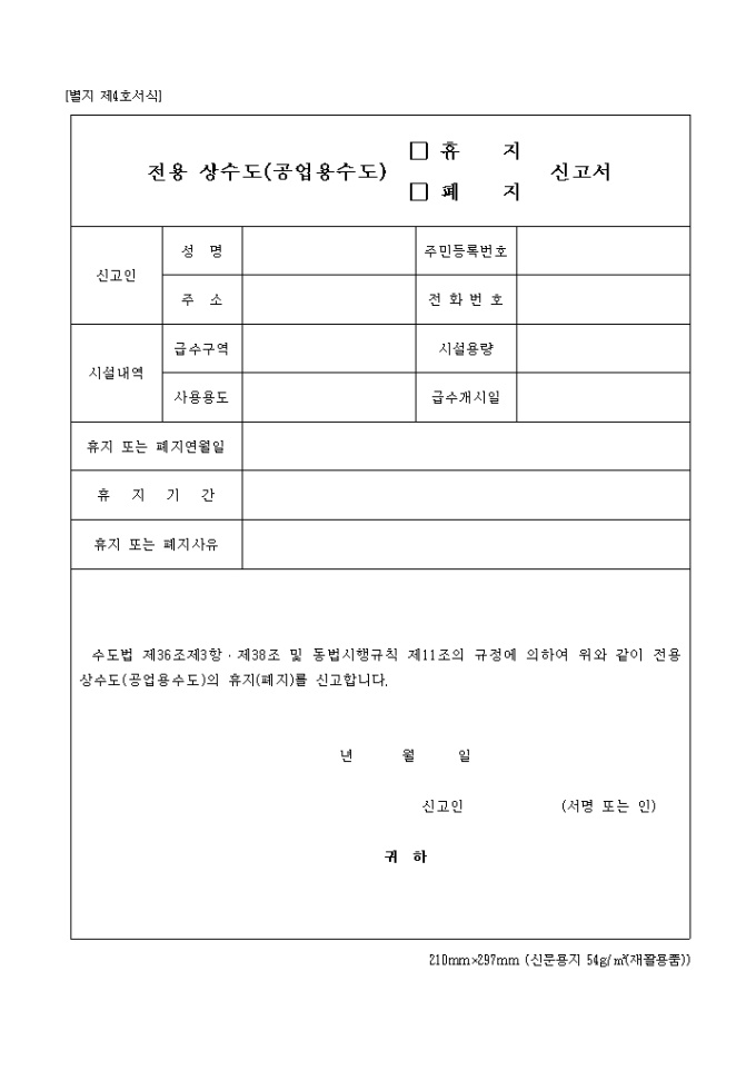 9,000원/월별지 제4호서식으로 도법 제36조제3항·제38조 및 동법시행규칙 제11조의 규정에 의하여 전용상수도(공업용수도)의 휴지(폐지)를 신고할때 사용하는 양식입니다.