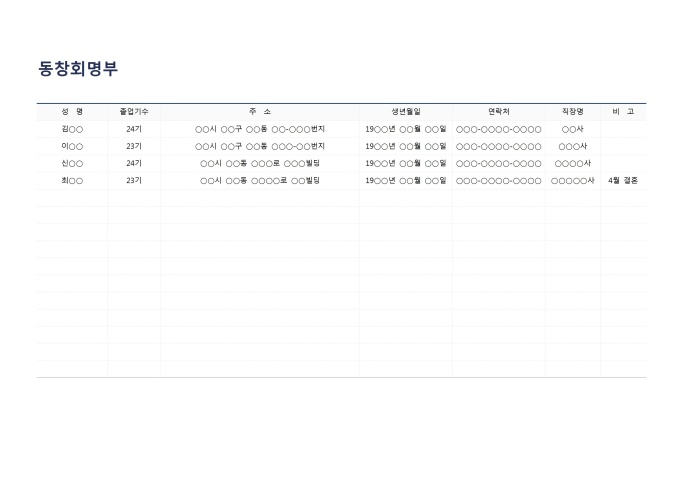 동창회명부입니다. 성명, 졸업기수, 주소, 생년월일, 연락처, 직장명, 비고 등의 항목으로 구성되어 있습니다.