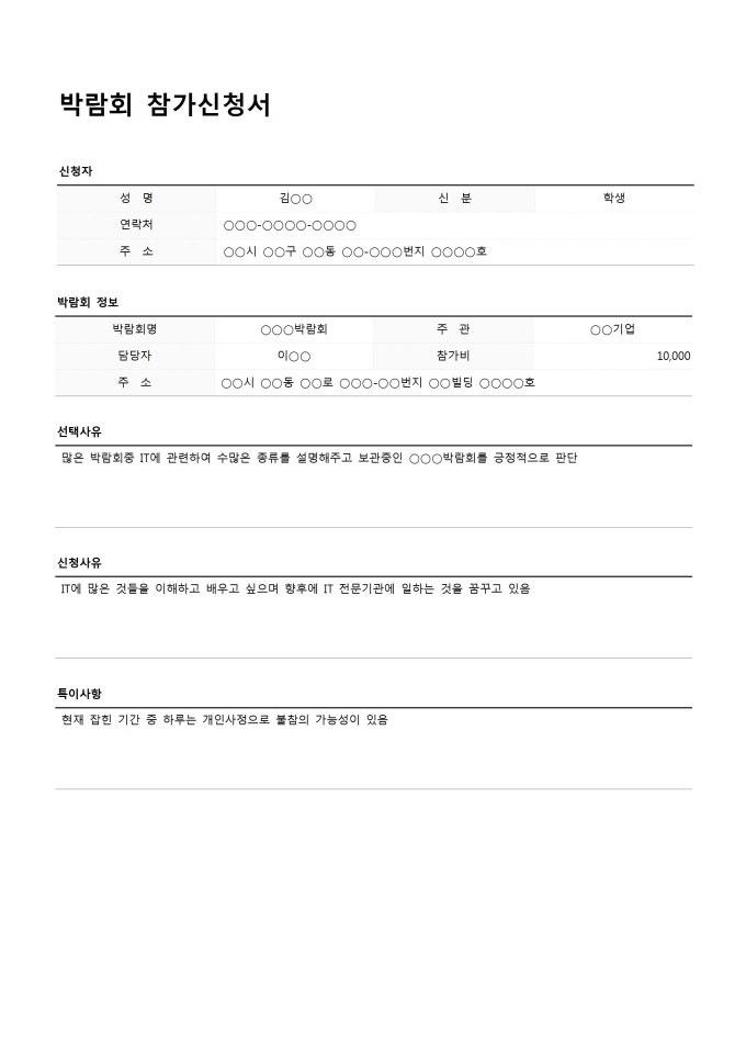 박람회참가신청서입니다. 신청자 성명, 신분, 연락처, 주소, 박람회 정보 박람회명, 주관, 담당자, 참가비, 주소, 선택사유, 신청사유, 특이사항 등의 항목으로 구성되어 있습니다.