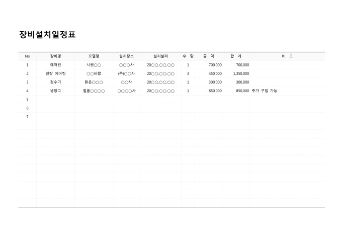 9,000원/월장비설치일정표입니다. NO, 장비명, 모델명, 설치장소, 설치날짜, 수량, 금액, 합계, 비고 등의 항목으로 구성되어 있습니다.