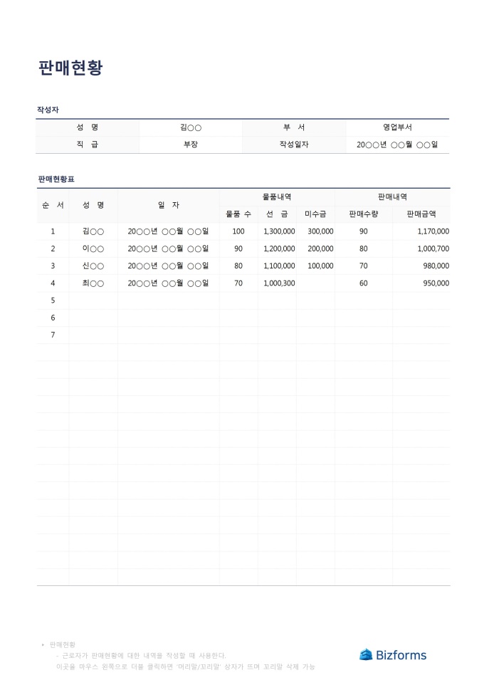 9,000원/월판매현황입니다. 성명, 부서, 직급, 작성일자, 순서, 성명, 일자, 물품내역 물품 수, 선금, 미수금, 판매내역 판매수량, 판매금액 등의 항목으로 구성되어 있습니다.