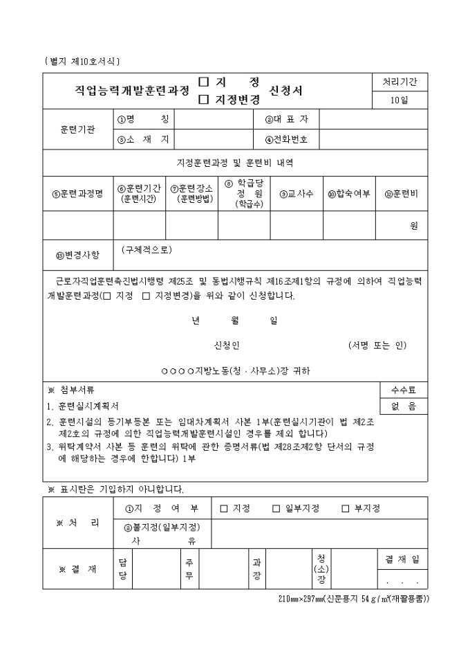 9,000원/월근로자직업훈련촉진법시행령 제25조 및 동법시행규칙 제16조제1항의 규정에 의하여 직업능력개발훈련과정(□지정 □지정변경)을 신청할때 사용하는 양식입니다.