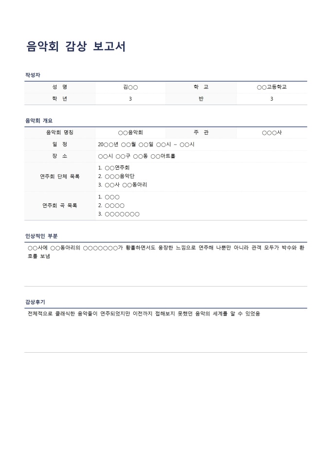 9,000원/월음악회감상보고서입니다. 성명, 학교, 학년, 반, 음악회 명칭, 주관, 일정, 장소, 연주회 단체 목록, 연주회 곡 목록, 인상적인 부분, 감상후기 등의 항목으로 구성되어 있습니다.