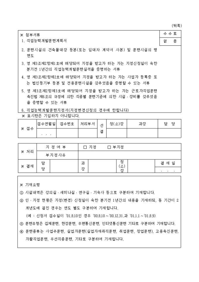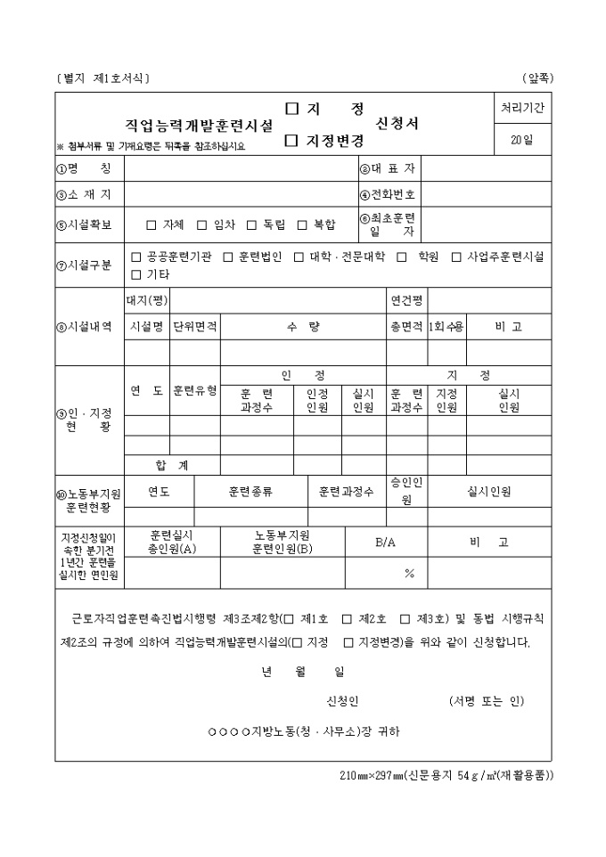 9,000원/월근로자직업훈련촉진법시행령 제3조제2항(□제1호 □제2호 □제3호) 및 동법 시행규칙 제2조의 규정에 의하여 직업능력개발훈련시설의(□지정 □지정변경) 신청할때 사용하는 양식입니다.
