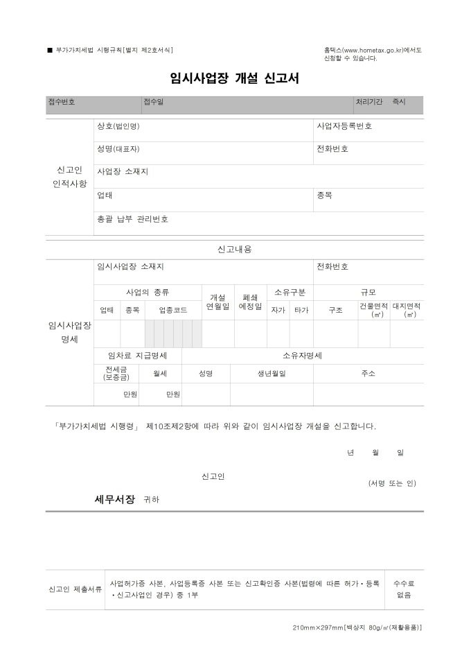 부가가치세법에 따라서 임시로 사업장을 개설하여 신고할 때 사용하는 문서입니다. (출처: 기획재정부)