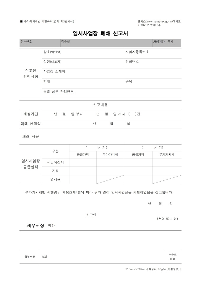 9,000원/월부가가치세법에 따라서 임시로 사업장을 개설한 이후에 폐쇄를 신고할 때 사용하는 문서입니다. (출처: 기획재정부)