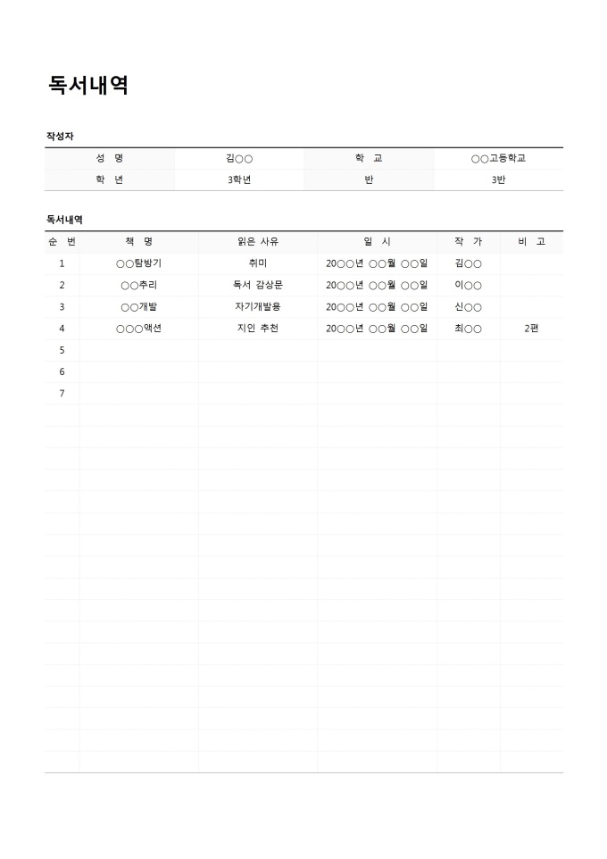 9,000원/월독서내역입니다. 성명, 학교, 학년, 반, 순번, 책명, 읽은 사유, 일시, 작가, 비고 등의 항목으로 구성되어 있습니다.