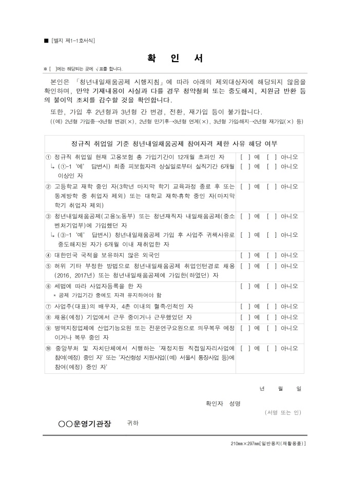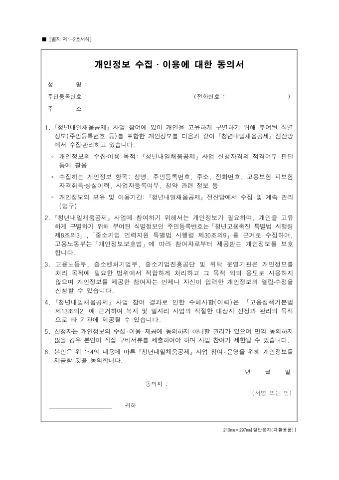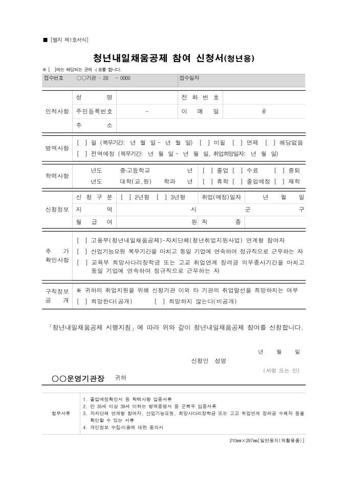 9,000원/월중소, 중견기업에 정규직으로 취업한 만 15~34세 청년이 일정 기간 돈을 적립하면 정부와 기업의 지원금을 더해서 목돈을 마련하고 장기근속을 할 수 있도록 하는 정책인 청년내일채움공제를 신청할 때 사용하는 청년용 서식입니다.