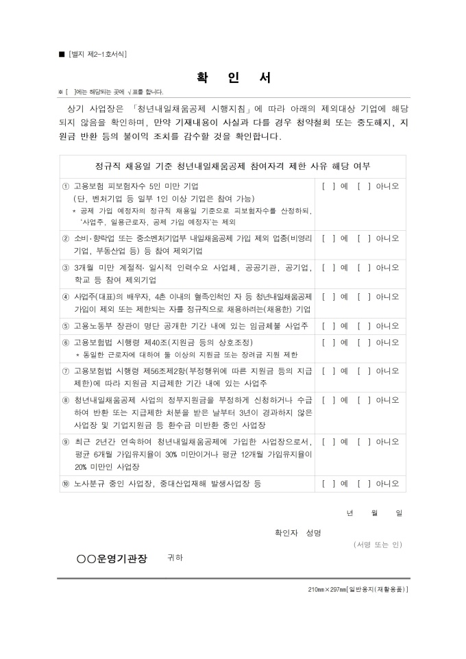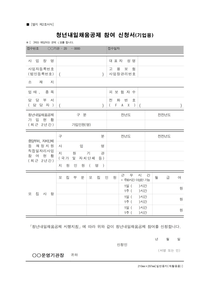 9,000원/월중소, 중견기업에 정규직으로 취업한 만 15~34세 청년이 일정 기간 돈을 적립하면 정부와 기업의 지원금을 더해서 목돈을 마련하고 장기근속을 할 수 있도록 하는 정책인 청년내일채움공제를 신청할 때 사용하는 기업용 서식입니다.