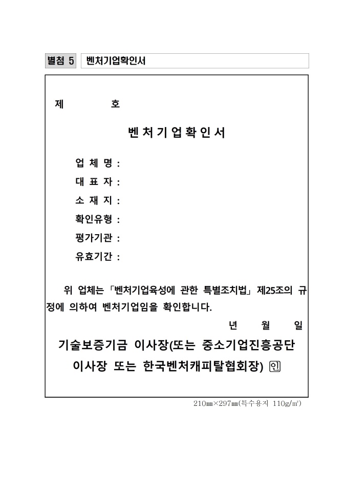 벤처기업육성에 관한 특별조치법 제25조에 의하여 벤처기업을 확인할 때 사용합니다.