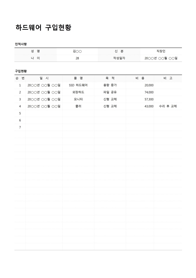 9,000원/월하드웨어구입현황입니다. 성명, 신분, 나이, 작성일자, 순번, 일시, 품명, 목적, 비용, 비고 등의 항목으로 구성되어 있습니다.
