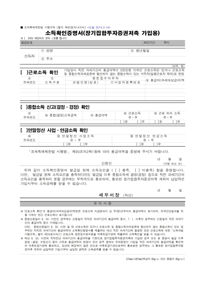 소득확인증명서(장기집합투자증권저축 가입용)