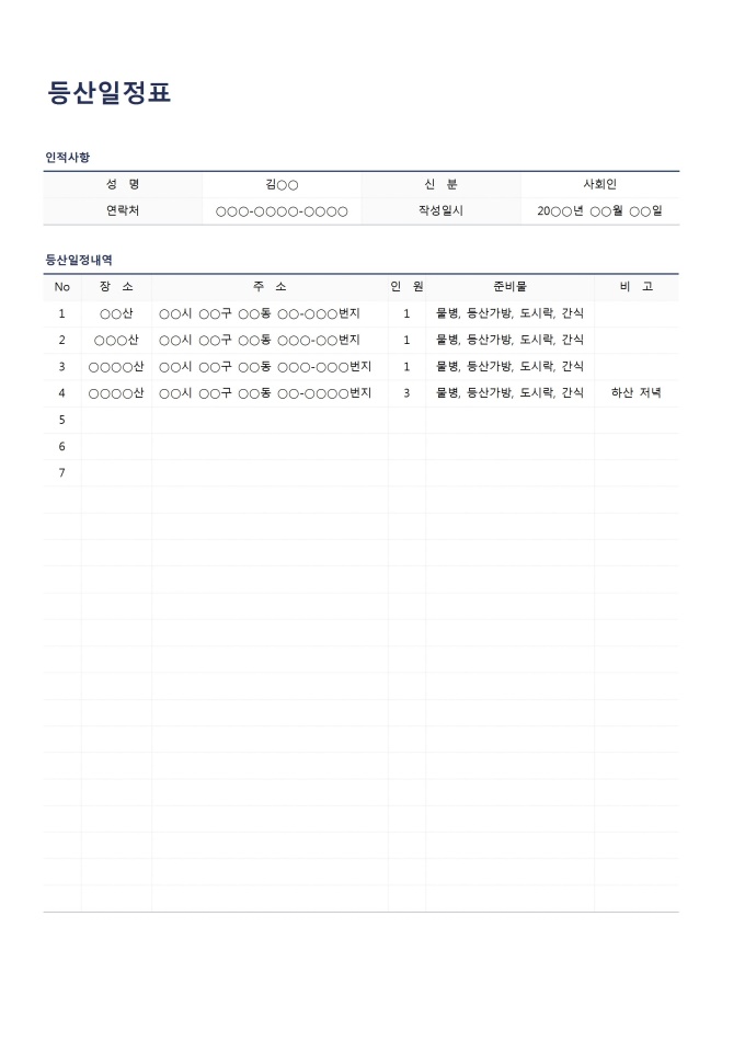 등산일정표입니다. 성명, 신분, 연락처, 작성일시, No, 장소, 주소, 인원, 준비물, 비고 등의 항목으로 구성되어 있습니다.