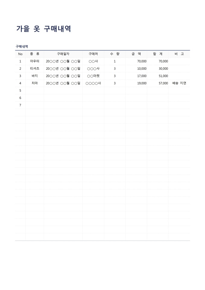 가을옷구매내역입니다. No, 종류, 구매일자, 구매처, 수량, 금액, 합계, 비고 등의 항목으로 구성되어 있습니다.