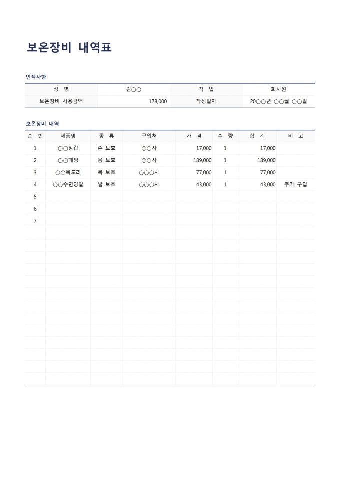 보온장비내역표입니다. 성명, 직업, 보온장비 사용금액, 작성일자, 순번, 제품명, 종류, 구입처, 가격, 수량, 합계, 비고 등의 항목으로 구성되어 있습니다.