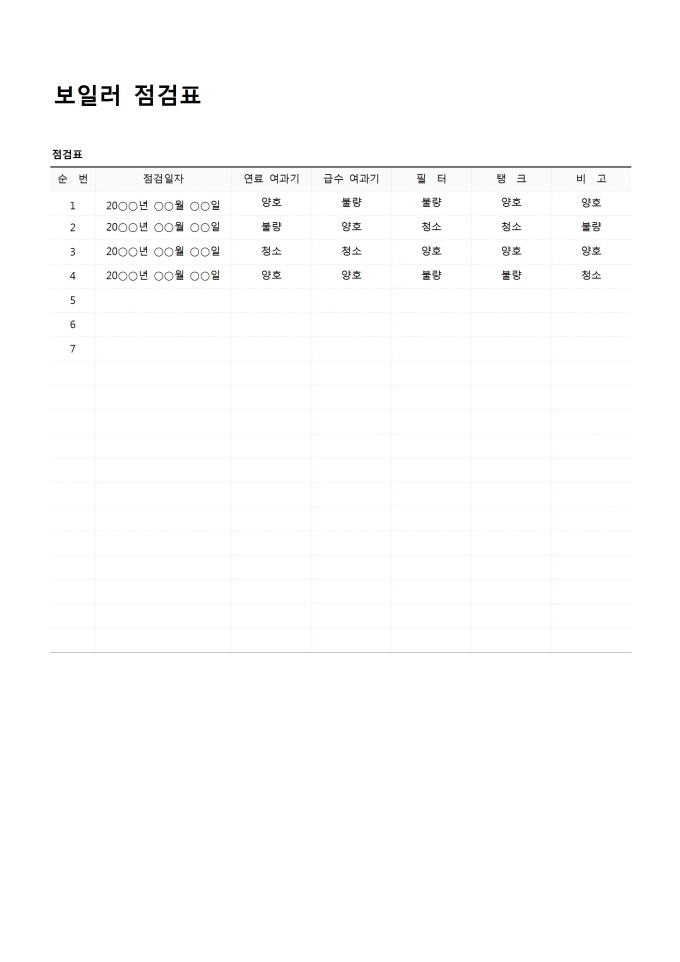 9,000원/월보일러점검표입니다. 순번, 점검일자, 연료 여과기, 급수 여과기, 필터, 탱크, 비고 등의 항목으로 구성되어 있습니다.