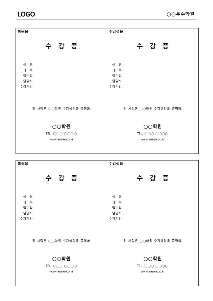 9,000원/월해당 서식은 학원의 현장, 실무에서 필요한 서식을 바탕으로 최적화된 학원 문서입니다. 샘플내용이 포함되어 있어 신입 강사부터 원장님까지 누구나 쉽고 편리하게 작성, 관리할 수 있습니다. 학원로고를 삽입하거나 학원명을 삽입하여 통일화된 양식으로 우리 학원만의 문서체계를 확립할 수 있습니다. 문서의 성격과 용도에 따라 안정적인 문서레이아웃으로 구성되어 문서 활용도가 높습니다. 학원 수강증 ▷ 용도 : 해당 학원의 수강생임을 나타내기 위해 작성 및 발급하는 서식입니다. ▷ 서식활용 TIP : 제출용으로 사용할 수 있는 문서로 해당 수강생의 인적사항을 정확히 기재하고 학원의 직인을 포함하여 발급합니다. ☞ 학원 서식 기획전 보러가기 (click!)
