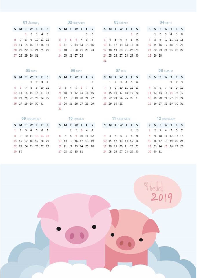 2019년 달력(원페이지,PPT달력,구름위돼지)입니다. 한 장에 12달이 다 들어있어 한 눈에 보기 편리한 달력입니다. 데스크나 벽에 부착하여 사용하시면 좋습니다.