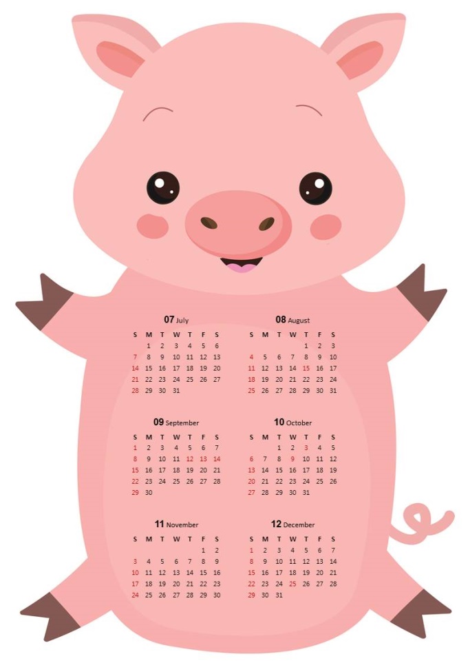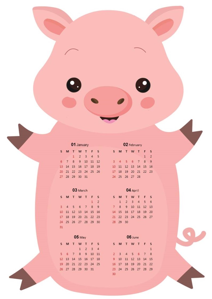 2019년 달력(반년달력,캐릭터달력,PPT달력,돼지한마리)입니다. 1~6월, 7~12월 두 장으로 나눠져있어 상반기, 하반기 관리하기에 편리한 달력입니다. 데스크나 벽에 부착하여 사용하시면 좋습니다.