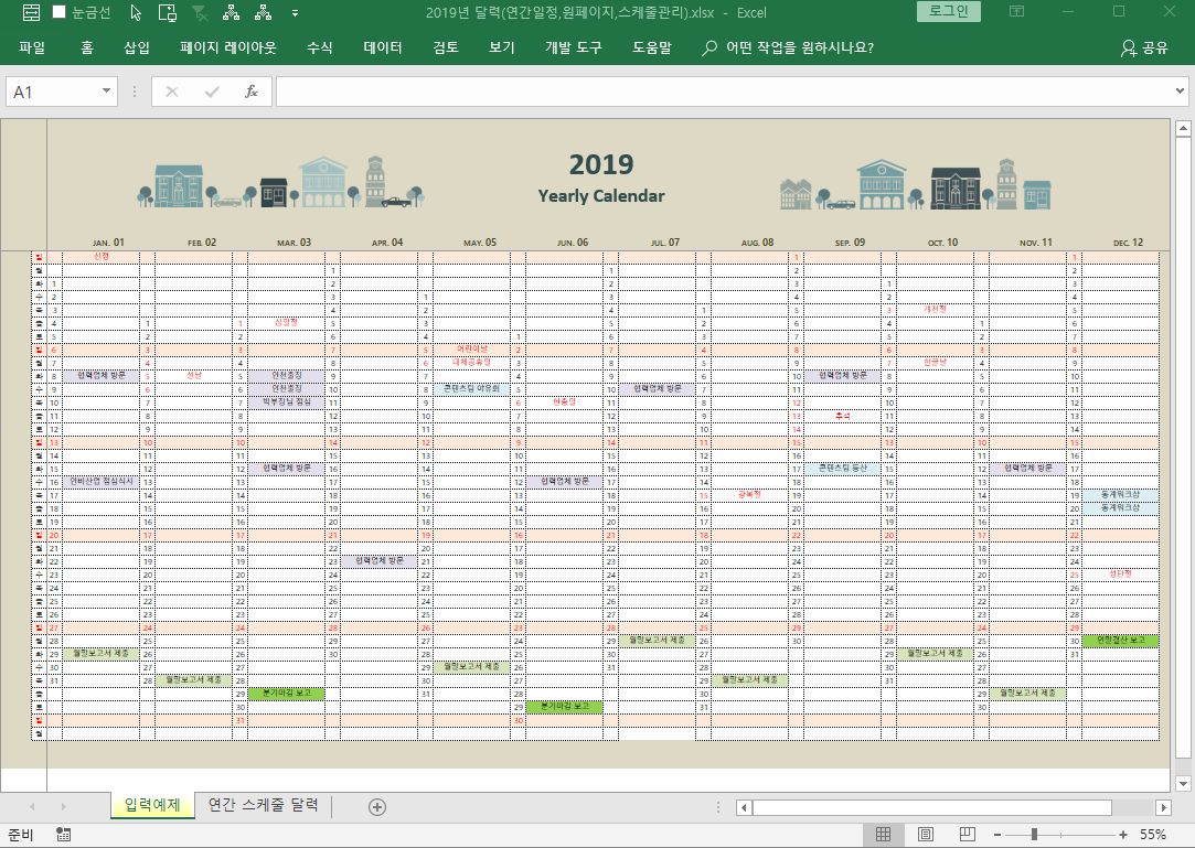 2019년 달력입니다. 연간일정과 함께 스케줄관리도 가능하게 제작되었으며 원페이지로 제작되어 한눈에 파악하실 수 있습니다.