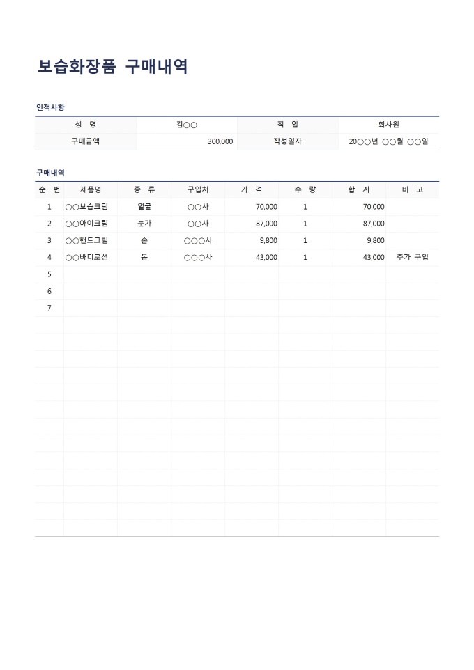 9,000원/월보습화장품구매내역입니다. 성명, 직업, 구매금액, 작성일자, 순번, 제품명, 종류, 구입처, 가격, 수량, 합계, 비고 등의 항목으로 구성되어 있습니다.