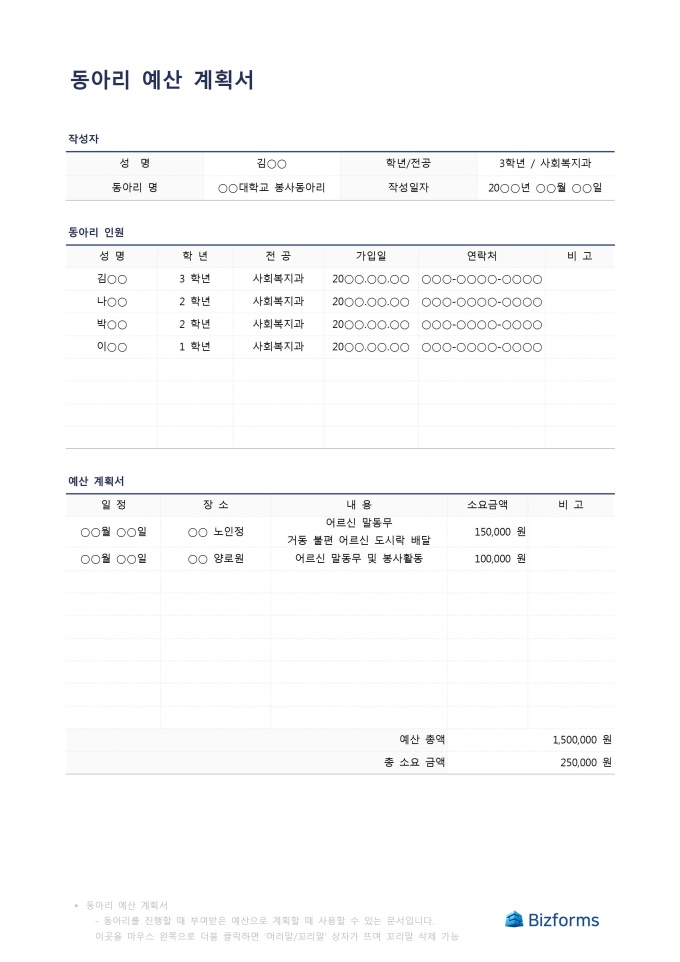 9,000원/월동아리 예산 계획서 입니다. 동아리에서 예산을 바탕으로 계획서를 작성할때 사용할 수 있는 문서입니다. 작성자, 동아리 인원, 예산계획서 등으로 구성되어 있습니다.