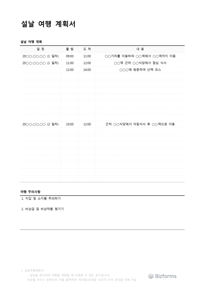 설날을 맞이하여 여행계획을 수립할때 사용할 수 있는 문서입니다. 여행계획, 주의사항으로 구성되어 있습니다.