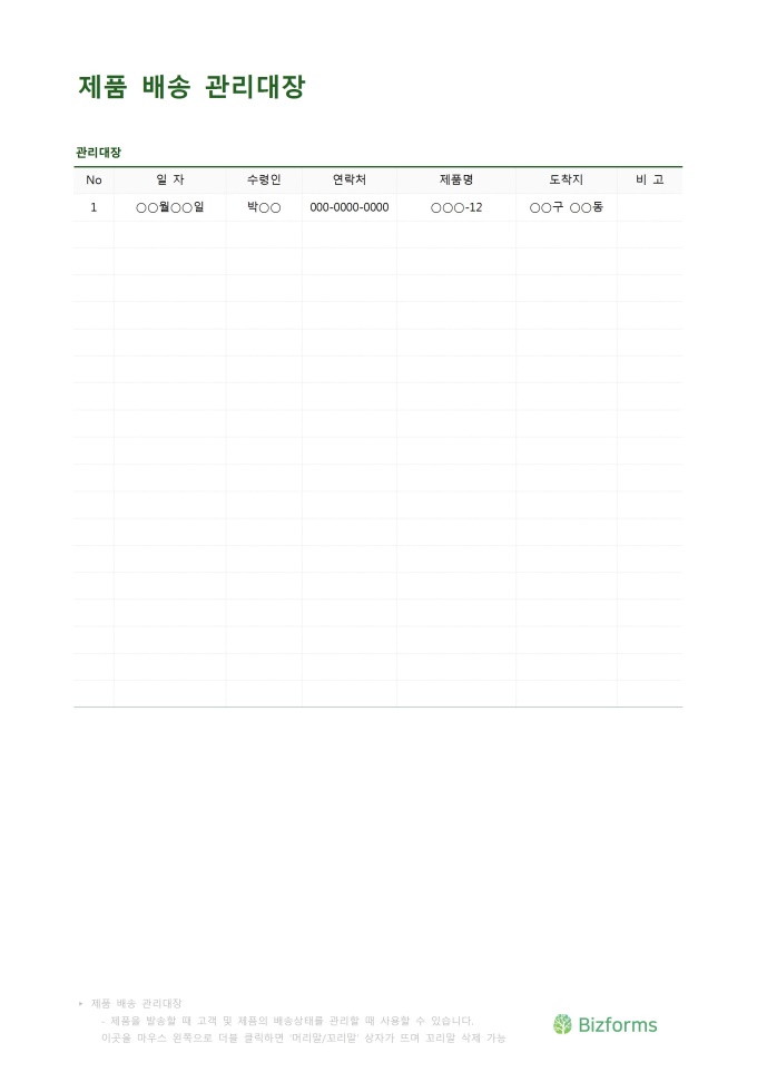 제품을 발송하기 위하여 일자, 수령인, 연락처, 제품명, 도착지 등을 간소하게 나타내어 판매량을 확인하는데 도움을 줄 수 있는 문서입니다.