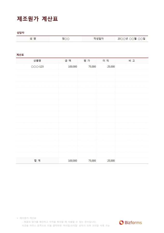 생산하는 제품명과 판매금액, 원가, 이익금을 간단하게 나타낸 형식으로 사용할 수 있습니다.