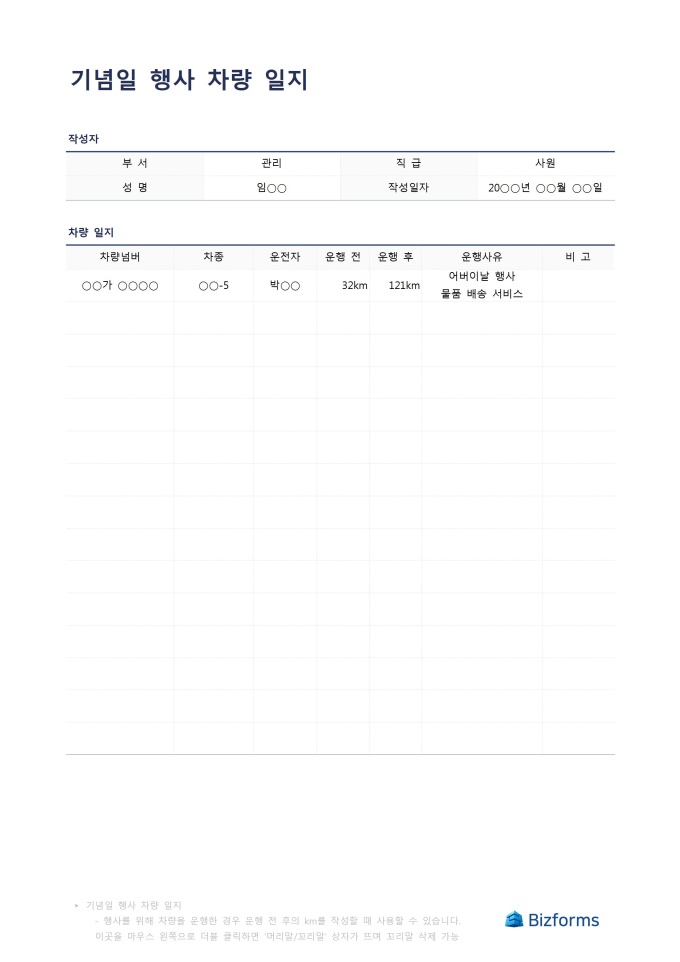 기념일을 맞이하여 행사를 진행할때 고객의 요청으로 상품들을 특정 장소로 배송할때 사용한 차량의 일지를 작성할때 사용할 수 있습니다.