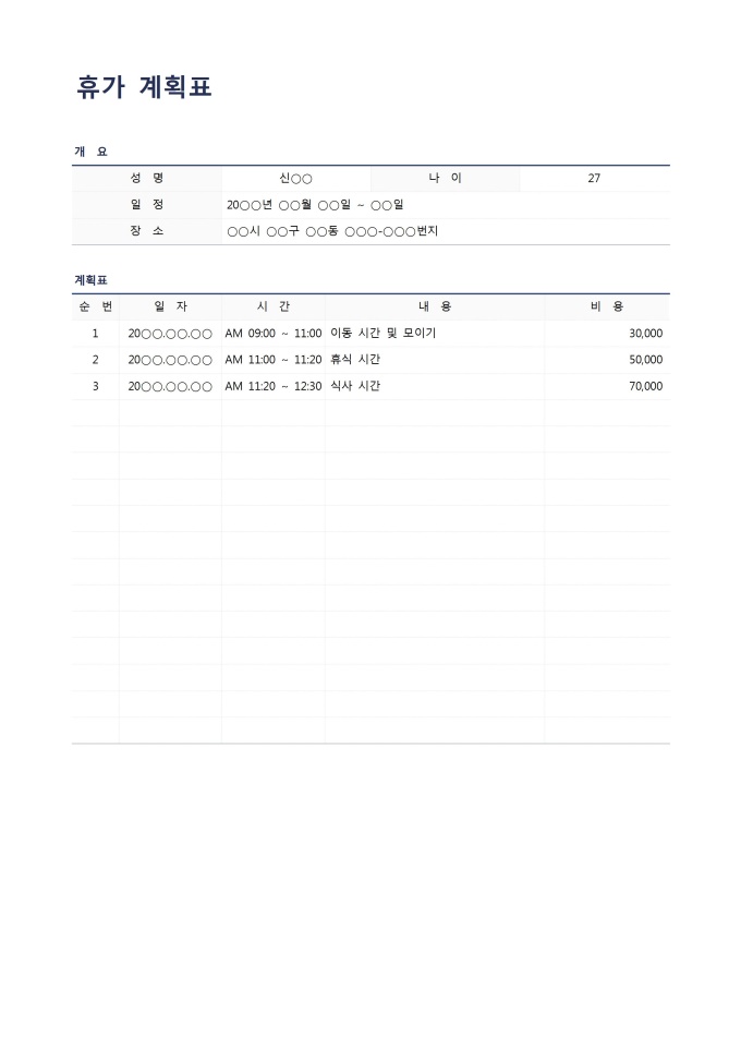 휴가계획표입니다. 휴가를 가기전 미리 상세한 계획을 작성할 때 사용할 수 있는 문서입니다.